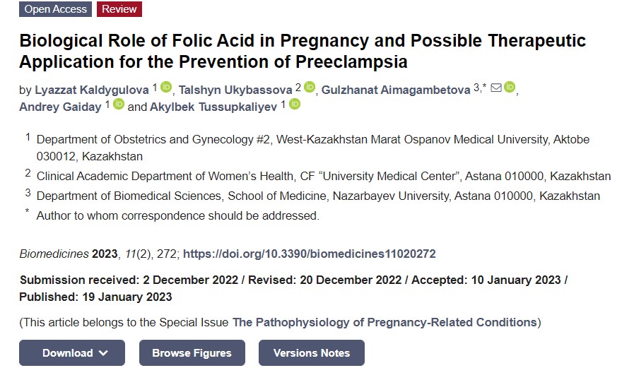[1] కల్డిగులోవా ఎల్, ఉకిబస్సోవా టి, ఐమాగంబెటోవా G, et al. గర్భం మరియు సాధ్యమైన చికిత్సా విధానంలో ఫోలిక్ యాసిడ్ యొక్క జీవసంబంధమైన పాత్ర ప్రీఎక్లంప్సియా నివారణకు దరఖాస్తు. బయోమెడిసిన్లు, 2023, 11(2): 272.https://doi.org/10.3390/biomedicines11020272