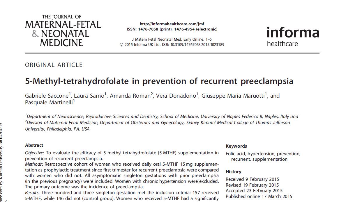 2015 ఇటాలియన్ రెట్రోస్పెక్టివ్ కోహోర్ట్ అధ్యయనం (n = 303 ప్రీఎక్లాంప్సియా ఉన్న మహిళలు) దానిని చూపించారు మొదటి త్రైమాసికం నుండి ప్రతిరోజూ 15 mg 5-MTHF మొత్తం పునరావృతతను తగ్గిస్తుంది ప్రీఎక్లంప్సియా 39.7 % నుండి 21.7 % (OR 0.57, 95 % CI 0.25–0.69), తీవ్రమైన ప్రీఎక్లంప్సియా 8.9 % నుండి 3.2 % (OR 0.44, 95 % CI 0.12–0.97), మరియు ప్రారంభ-ప్రారంభం ప్రీఎక్లంప్సియా 7.5 % నుండి 1.9 % (OR 0.34, 95 % CI 0.07–0.87) [2].