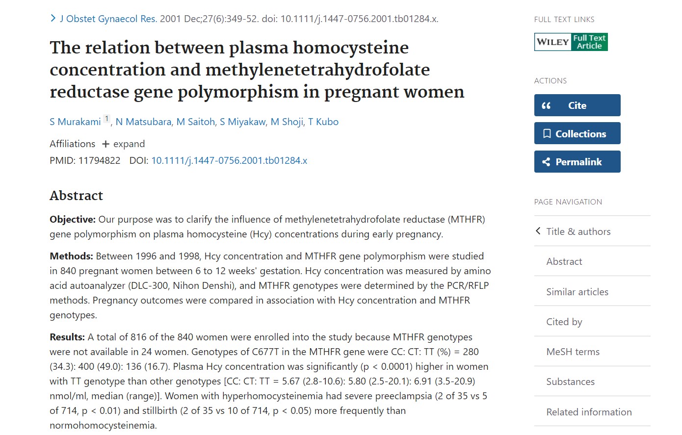 2002లో, ఒక పెద్ద జపనీస్ సమన్వయ అధ్యయనం (840 స్త్రీలు, 6-12 వారాల గర్భధారణ) ది జర్నల్ ఆఫ్ అబ్స్టెట్రిక్స్ మరియు గైనకాలజీ పరిశోధన గొలుసును పటిష్టం చేసింది: TT → Hcy పెరుగుదల → ప్రతికూల గర్భం ఫలితాలు.
