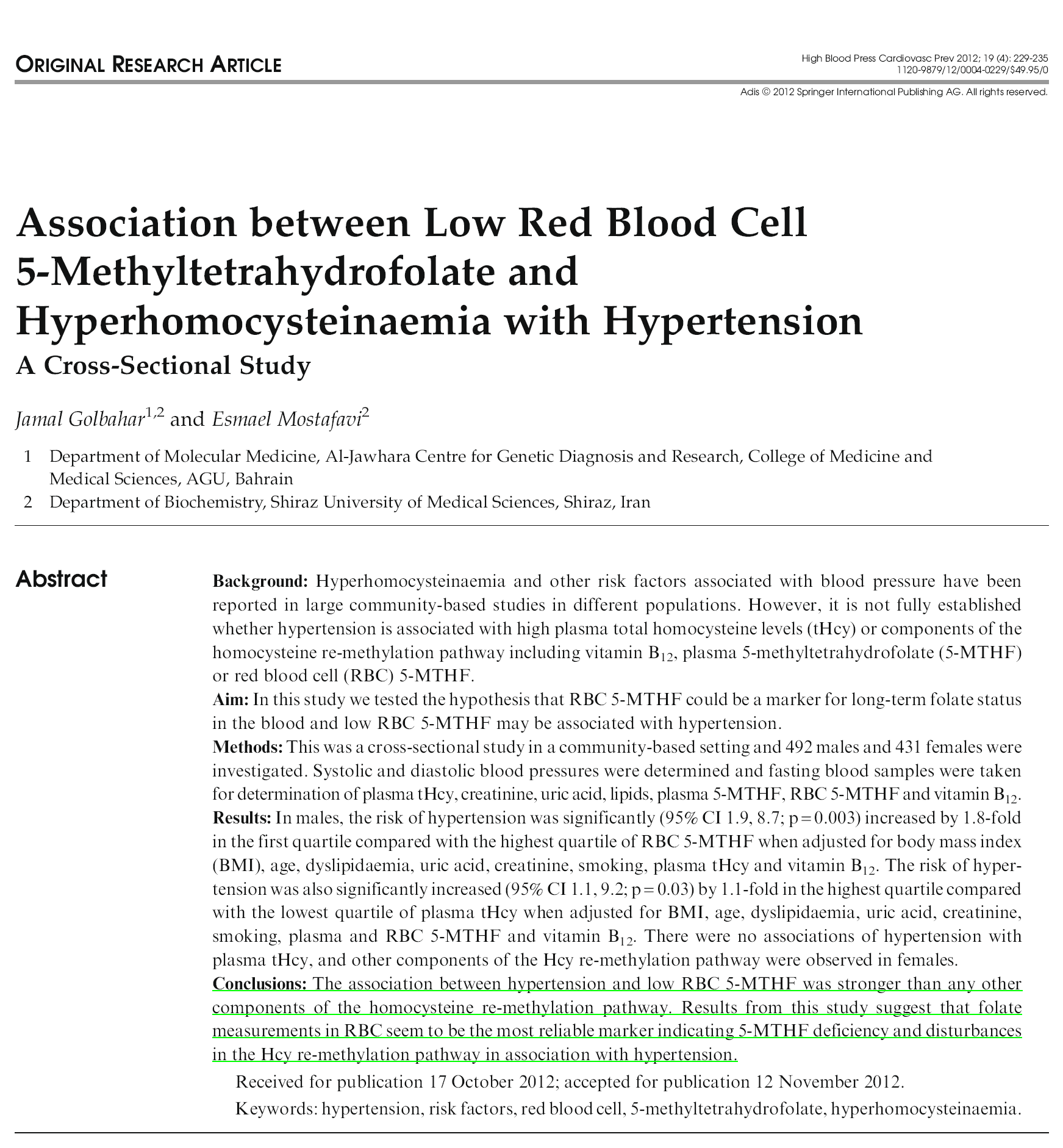 [1] తక్కువ ఎర్ర రక్త కణం 5-మిథైల్టెట్రాహైడ్రోఫోలేట్ మరియు హైపర్హోమోసిస్టీనిమియా విత్ హైపర్టెన్షన్ మధ్య అనుబంధం. *హై బ్లడ్ ప్రెజర్ & కార్డియోవాస్కులర్ ప్రివెన్షన్*, 2012.